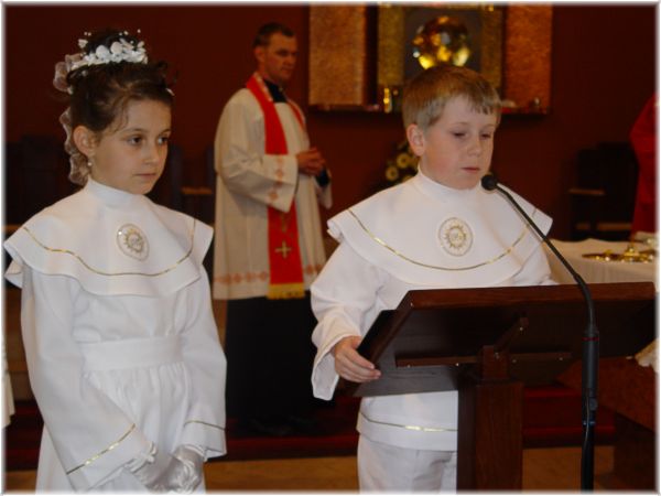 W niedzielę 15 maja 2005 roku w Uroczystość Zesłania Ducha Świętego, w czasie Mszy Świętej o godzinie 10.30, grupa 55 dzieci przeżywała swoja I Rocznicę Komunii Świętej. Mszy Świętej przewodniczył ks. Proboszcz Waldemar Taracha. Dzieci przypomniały sobie ten uroczysty dzień, kiedy po raz pierwszy przyjęły Jezusa do swoich serc i na nowo odnowiły przyjaźń ze swoim Przyjacielem – Jezusem. Mając Jezusa w swoim sercu będą Go niosły do swoich domów, do szkoły a przede wszystkim kochały drugiego człowieka, tak jak On. Dziękujemy wszystkim, którzy przyczynili się do uświetnienia tej uroczystości.